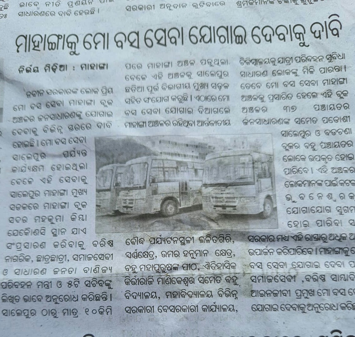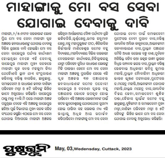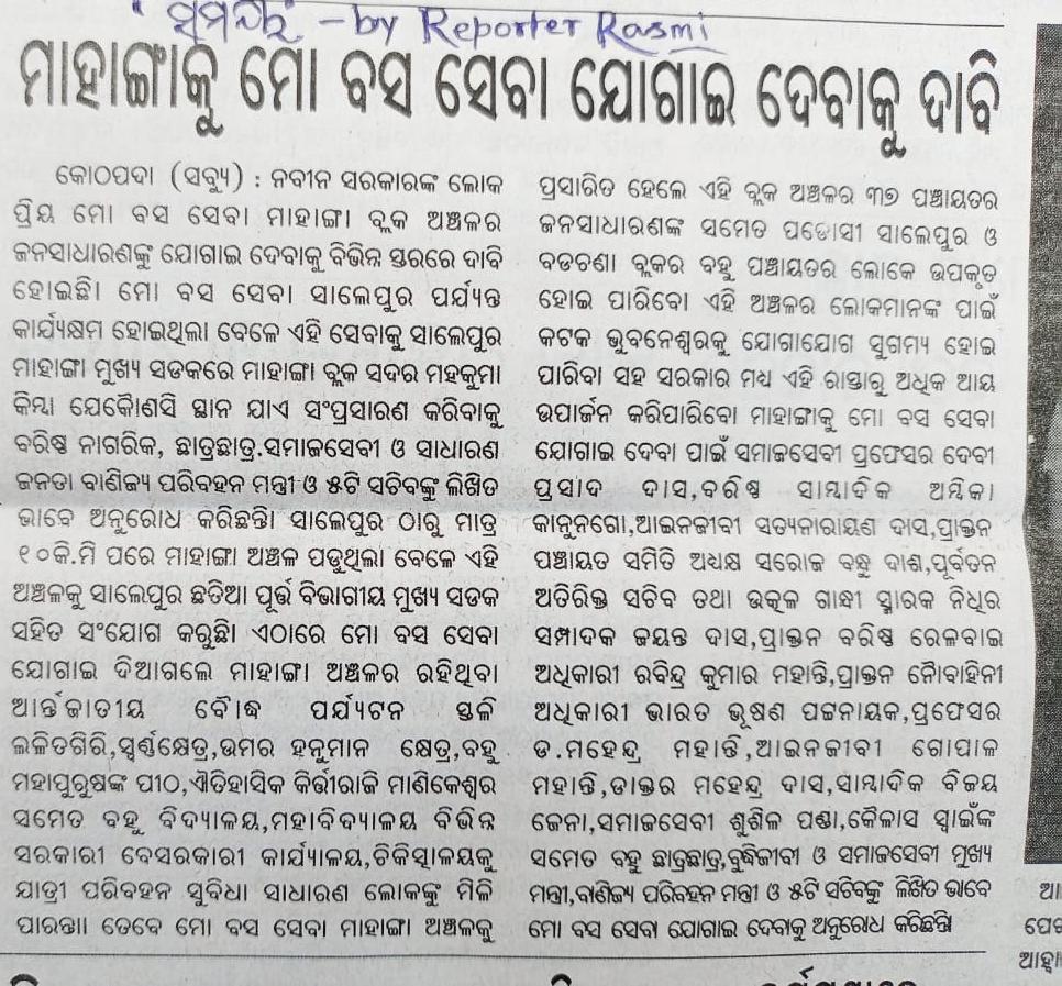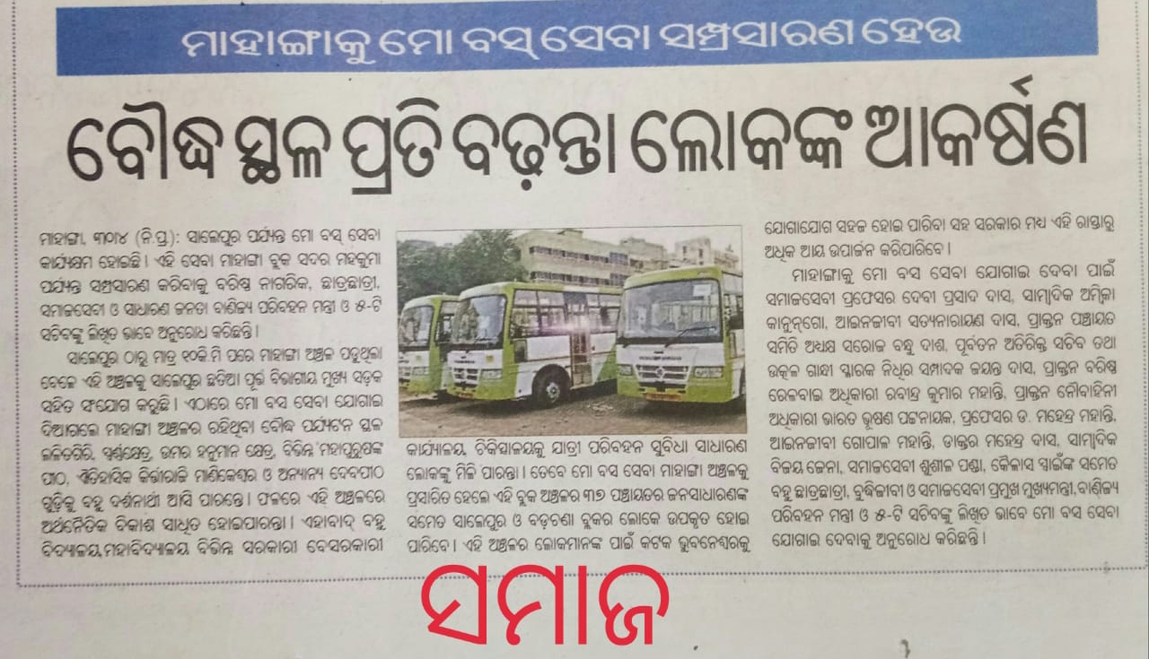 ପୂର୍ବ ରୁ ଫାଇବ ଟି ସଚିବ ଙ୍କୁ ଲିଖିତ ଭାବେ ଅନୁରୋଧ କରାଯାଇ ଥିଲା ବେଳେ ଏବେ ପୁଣି ଗୃହ ନିର୍ମାଣ ନଗର ଉନ୍ନୟନ ମନ୍ତ୍ରୀ ଓ ବିଭାଗୀୟ ପ୍ରମୁଖ ସଚିବ ଙ୍କୁ ବର୍ଷୀୟାନ ସମାଜସେବୀ ବିଶିଷ୍ଟ ଜୀବ ବିଜ୍ଞାନୀ ତଥା ସେବନିବୃତ୍ତ୍ ଅଧ୍ୟକ୍ଷ ଦେବୀପ୍ରସାଦ ଦାସ ମାନବାଧିକାର କର୍ମୀ ଆଇନଜୀବୀ ସତ୍ୟନାରାୟନ ଦାସ ବିଶିଷ୍ଟ ସାମ୍ବାଦିକ ଅମ୍ବିକା ପ୍ରସାଦ କାନୁନଗୋ ପ୍ରଫେସର୍ ଡକ୍ଟର ମହେନ୍ଦ୍ର ମହାନ୍ତି ସାମ୍ବାଦିକ ଉମାକାନ୍ତ ଜେନା ଧନେଶ୍ଵର ସେଠୀ ଦୁଷ୍ମନ୍ତ ନନ୍ଦ ଙ୍କ ସମେତ ବହୁ ବ୍ୟକ୍ତି ଓ ସମାଜସେବୀ ଲିଖିତ ଭାବେ ଅନୁରୋଧ କରୁଛନ୍ତି ।ମୋ ବସ ସେବା ର ପରିସର ଆଗକୁ ବଢ଼ିଲେ ହଜାର ହଜାର ସାଧାରଣ ଜନତା ଛାତ୍ର ଛାତ୍ରୀ ଙ୍କ ବହୁ ଦିନର ସମସ୍ୟା ସମାଧାନ ହେବ ।