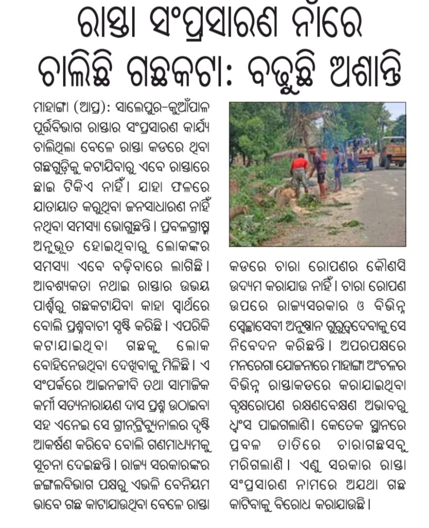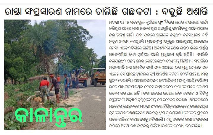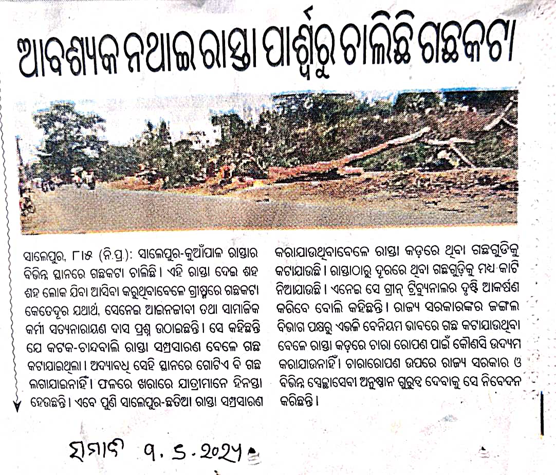 ପ୍ରବଳ ଗ୍ରୀଷ୍ମ ରେ ତତଲା ତାଉଆ ରେ ସାରା ରାଜ୍ୟ ଡହଳ ବିକଳ ହେଉଥିଲା ବେଳେ ସାଲେପୁର ଛତିଆ ସଡ଼କ ରେ ପ୍ରସସ୍ତିକରଣ ଆଳ ରେ ଶହ ଶହ ବଡ ବଡ ଗଛ କାଟି ଦିଆଯାଉଥିଲା ବେଳେ ଆବଶ୍ୟକତା ନ ଥାଇ ବି ଏପ୍ରିଲ ଓ ମେ ମାସ ରେ ବହୁ ଗଛ କୁ କାଟି ଦିଆଯାଉଥିବାରୁ ଜନ୍ ସାଧାରଣ ରେ ତୀବ୍ର ପ୍ରତିକ୍ରିୟା ଦେଖା ଦେଇଛି ।