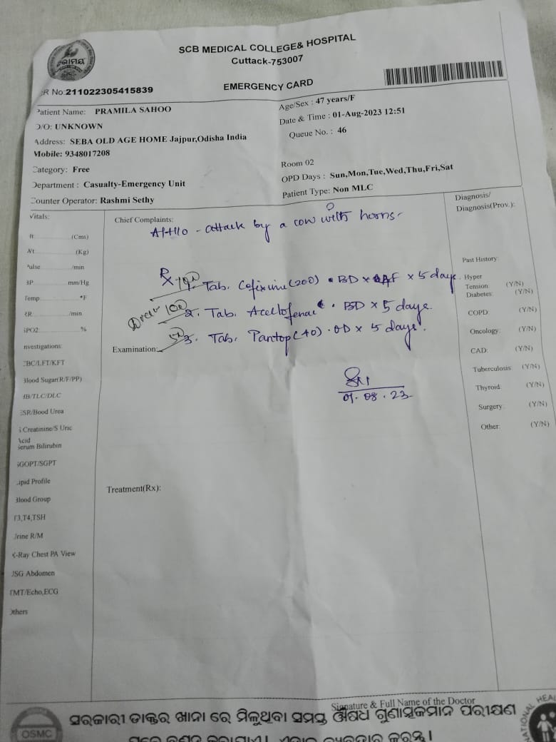 ଏମିତି ଏକ ଅଭାବନୀୟ ଘଟଣାର ଛ ତୀ ଆ ସ୍ଥିତ ସେବକ ଜରାଶ୍ରମ ରେ ଜଣେ ଅସହାୟ ମାନସିକ ବିକୃତ ମହିଳା ପ୍ରମିଳା ସାହୁ ଓଠ ରେ ଗଭୀର କ୍ଷତ ପାଇଁ କଟକ ସ୍ଥିତ ଶ୍ରୀ ରାମ ଚନ୍ଦ୍ର ଭେଷଜ ମହାବିଦ୍ୟାଳୟ ରେ ଚିକିତ୍ସା ପାଇଁ ଭର୍ତ୍ତି ହୋଇଥିଲେ । ତେବେ ଅସହାୟଙ୍କୁ ଯତ୍ନ ନେବା ପାଇଁ ନିଯୁକ୍ତ ଏଜେନ୍ସି ର କାଯ୍ୟକାଳ ସାରି ଯାଇଥିବାରୁ ଓ ନୂତନ ଏହେନ୍ସି ଦାୟିତ୍ଵ ନେଇ ନଥିବାରୁ ଉକ୍ତ ମହିଳା ଙ୍କୁ ଡାକ୍ତଖାନା ରେ ନ ରଖି ଚିକିତ୍ସା କରି ସ୍ୱେଛl ସେବୀ ନଥିବାରୁ ଫେରେଇ ଦିଆଯାଇଥିଲା ।