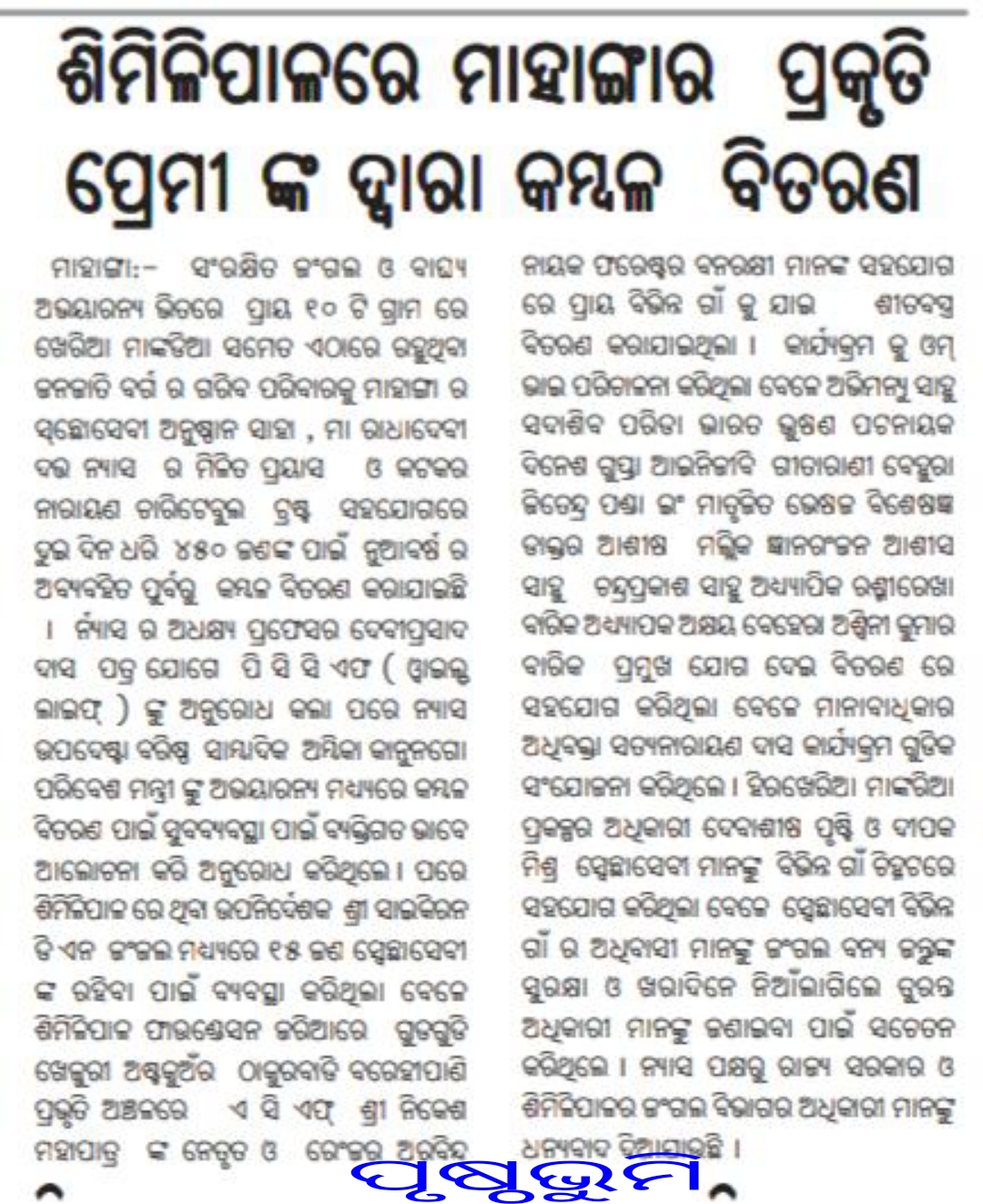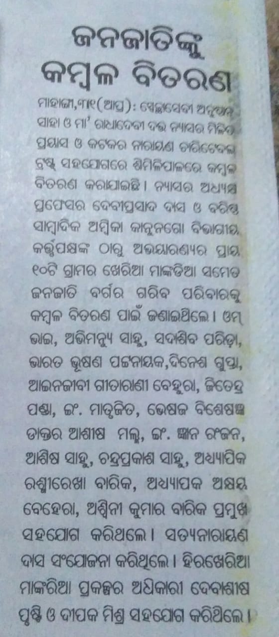 ଏସ ସି ଏଫ ଶ୍ରୀ ନିକେଶ ମହାପାତ୍ର ସାରା ଦିନ ଦଳ ସହ ରହି କମ୍ବଳ ବିତରଣ ରେ ବିଭିନ୍ନ ଦୁର୍ଗମ ସ୍ଥାନ କୁ ଯାଇ ଅକ୍ଲାନ୍ତ ସହଯୋଗ କରିଥିଲା ବେଳେ ରେଂଜର ଅରବିନ୍ଦ ନାୟକ ବନପାଳ ଉତ୍ତମ ମହାନ୍ତ ପଂଚାନନ ଗିରି ଡି ଇ ଓ ମାନସ ମହାନ୍ତ ବନରକ୍ଷୀ ଓ ଗାଡିଚାଳକ ଭାଇ ଅନିଲ ମହାନ୍ତ ରୋଷାଇ କରିବାକୁ ସମସ୍ତ ବ୍ୟବସ୍ଥା କରିବା ସହ ଆମ କୁ ପ୍ରତେକ ଟି ସହଯୋଗ କରିଥିବାରୁ ସେମାନଙ୍କୁ କୃତଜ୍ଞତା ଜଣାଇଥିଲେ ସମସ୍ତେ … ଅନୁରୋଧ ରକ୍ଷ କରି ଏସ ଏଫ୍ ସାର ଙ୍କ ସହ ସମସ୍ତ କର୍ମଚାରୀ ପାଙ୍ଗତ ରେ ବସି ଭାତ ଡାଲମା ସମାଜସେବୀ ଙ୍କ ସହ ବସି ଆନନ୍ଦ ବଜାର ରେ ଖାଇବା ରେ ବଢିଥିଲା ସମସ୍ତ ଙ୍କ ଉତ୍ସାହ । ମାନ୍ୟବର ଜଙ୍ଗଲ ଓ ପରିବେଶ ମନ୍ତ୍ରୀ ସଚିବ ଓ ପି ପି ସି ଏଫ ( ଓ୍ବାଇଲ୍ଡ ଲାଇଫ) ଙ୍କ ସହଯୋଗ ପାଇଁ ଦଳରେ ଥିବା ସମସ୍ତ ସଦସ୍ୟ ସଦସ୍ୟା ଜଣେଇଥିଲେ କୃତଜ୍ଞତା ତେବେ କର୍ଯ୍ୟଲ୍ରମ ପାଇଁ ସମସ୍ତ ସହଯୋଗ କରିଥିବା ବିଶିଷ୍ଟ ସାମ୍ବାଦିକ ଅମ୍ବିକା କାନୁନଗୋ ଓ ବରିଷ୍ଟ ସମାଜସେବୀ ପ୍ରଫେସର୍ ଦେବୀପ୍ରସାଦ ଦାସ ଙ୍କୁ ମଧ୍ୟ ସମସ୍ତେ ସାଧୁବାଦ୍ ଜଣାଇଥିଲେ