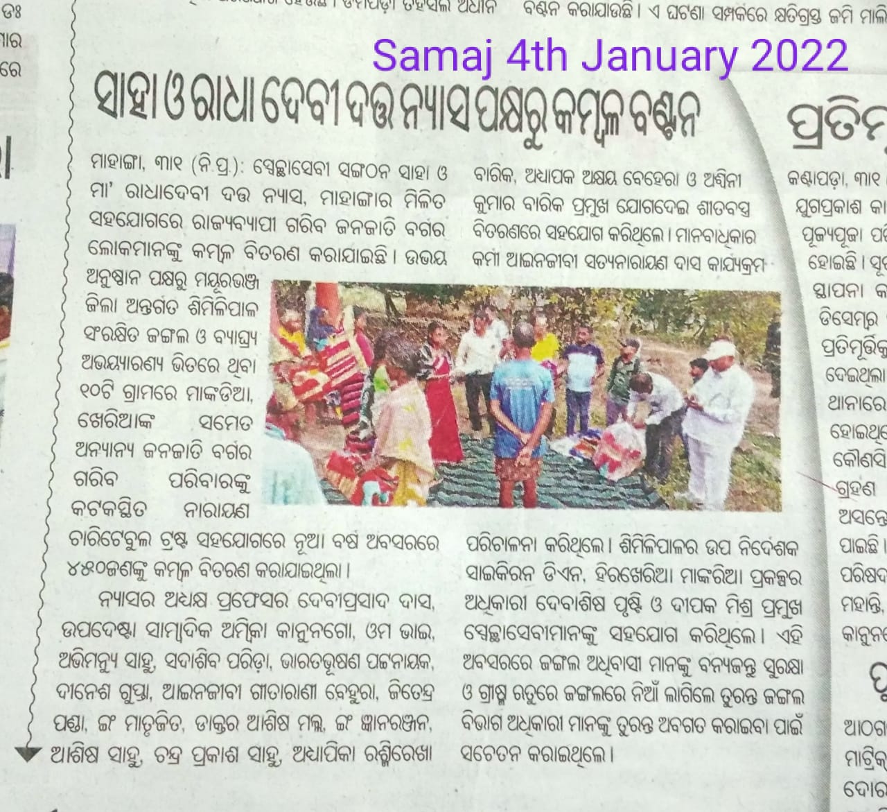 ଶୀତବତୁରା ଶିମିଳିପାଳ ର କିଛି ଦୁର୍ଗମ ପାହାଡୀ ଗାଁରେ କମ୍ବଳ ଟିଏ ଅନୁରାଗ ର ସହ ତୋଳିଦେବା ପାଇଁ ସାହା ର ସଂଯୋଜନା ରେ ଏକ ପ୍ରତିନିଧି ଦଳ ଡିସେମ୍ବର ୨୮ ରେ ପହଞ୍ଚିଥିଲେ ଶିମିଳିପାଳରେ । ଜଂଗଲ ଭିତରେ ଅଧିକାରୀ ମାନଙ୍କ ଆପଣାପଣ ଓ ଆତ୍ମୀୟତା ରେ ସେମାନେ ବେଶ ଖୁସି ଅନୁଭବ କରୁଥିଲା ବେଳେ ସେମାନେ ରହିବା ପାଇଁ ଜଙ୍ଗଲ ଭିତରେ ରହଣୀ ପାଇଁ ବ୍ୟବସ୍ଥା କରିଥିବା ବେଳେ ସମସ୍ତେ ମିଳି ମିଶି ଆନନ୍ଦ ବଜାର ପାଇଁ ପ୍ରସ୍ତୁତି ରେ ଲାଗିପଡି ଥିଲେ ।.